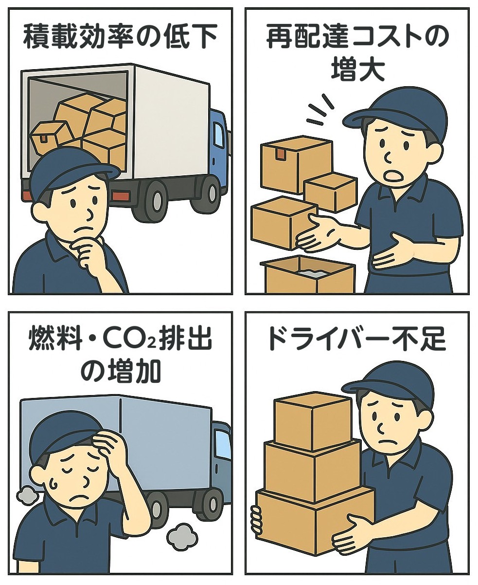 - 大きすぎる箱が積載効率を下げ、 再配達や空運送が増える現場。